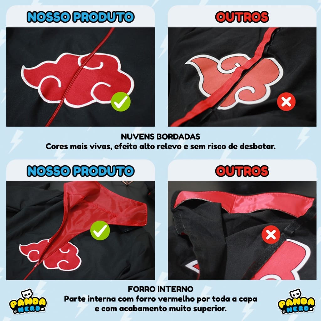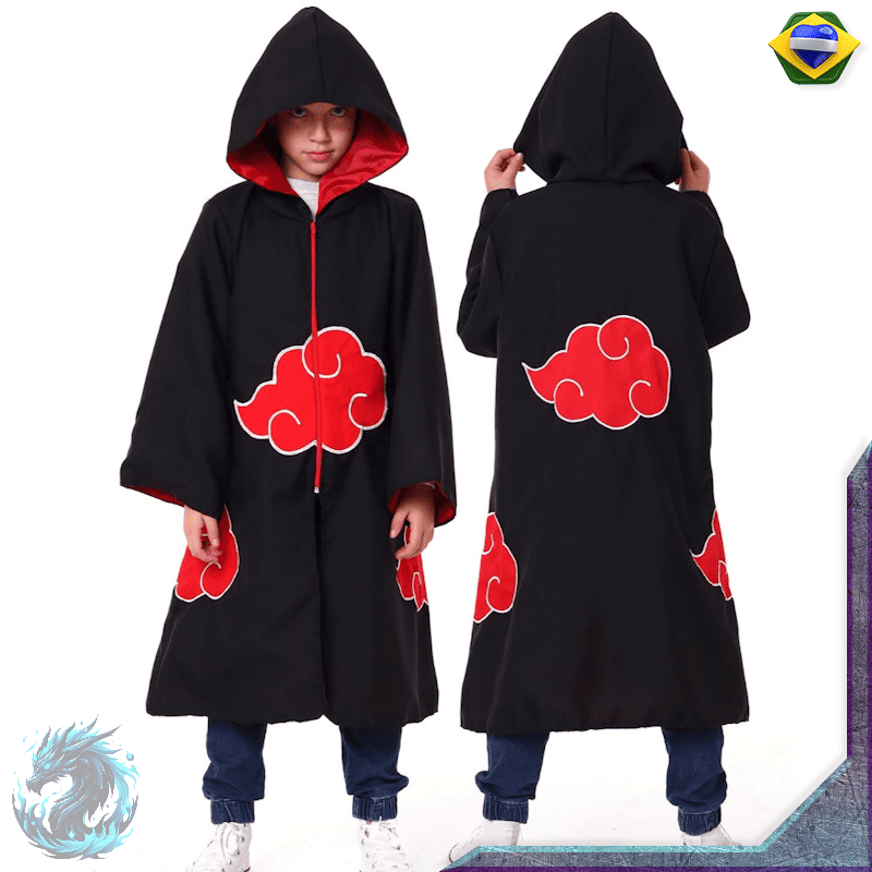 Manto bordado inspirado na Akatsuki, ideal para fãs de Naruto. Disponível em tamanhos infantil e adulto, perfeito para cosplay, eventos temáticos ou colecionadores de anime.